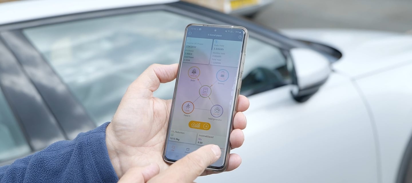 Cloud-based monitoring of PV, consumption, grid import/export and storage status.